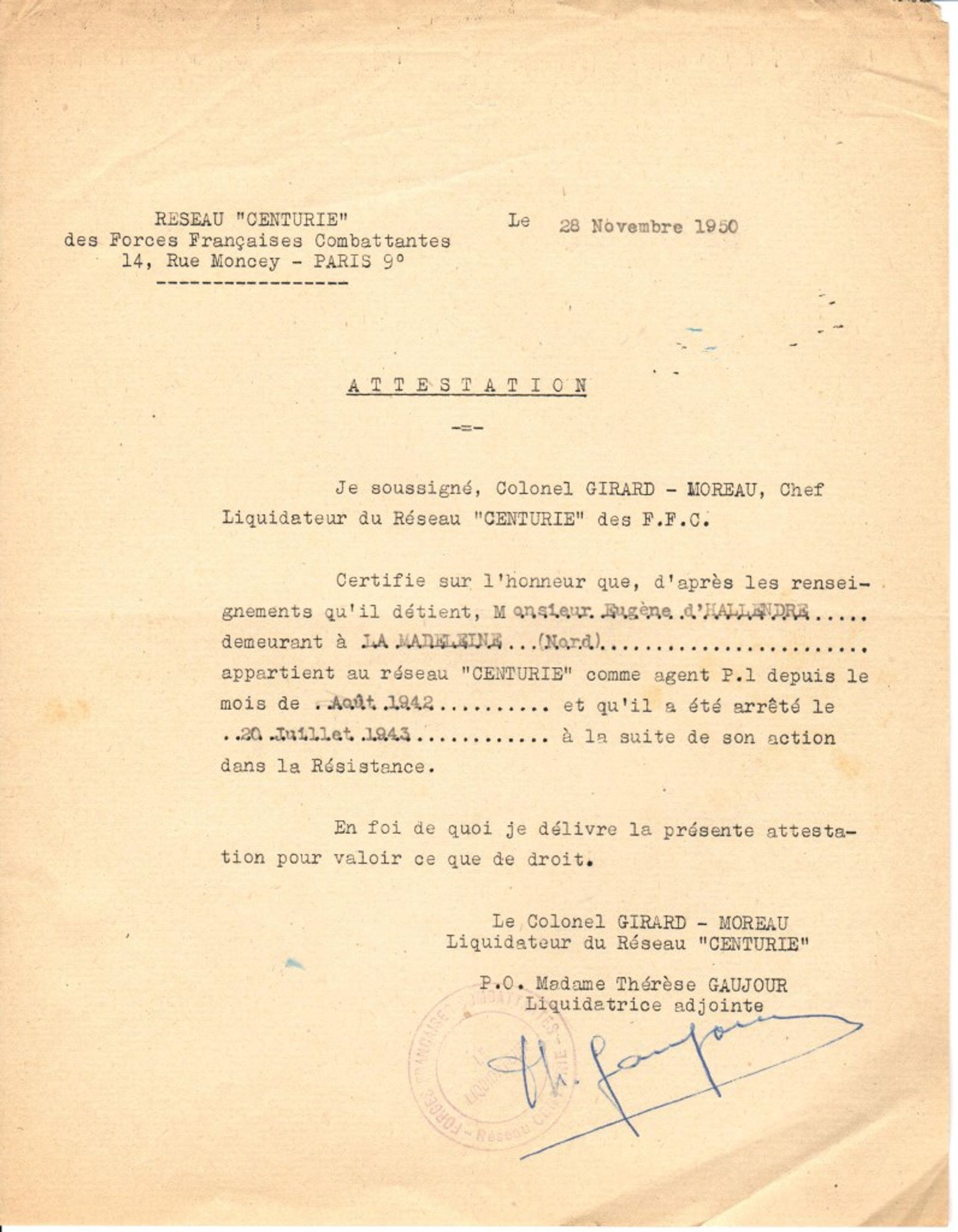 Attestation d'appartenance au réseau Centurie d'Eugène D'Hallendre