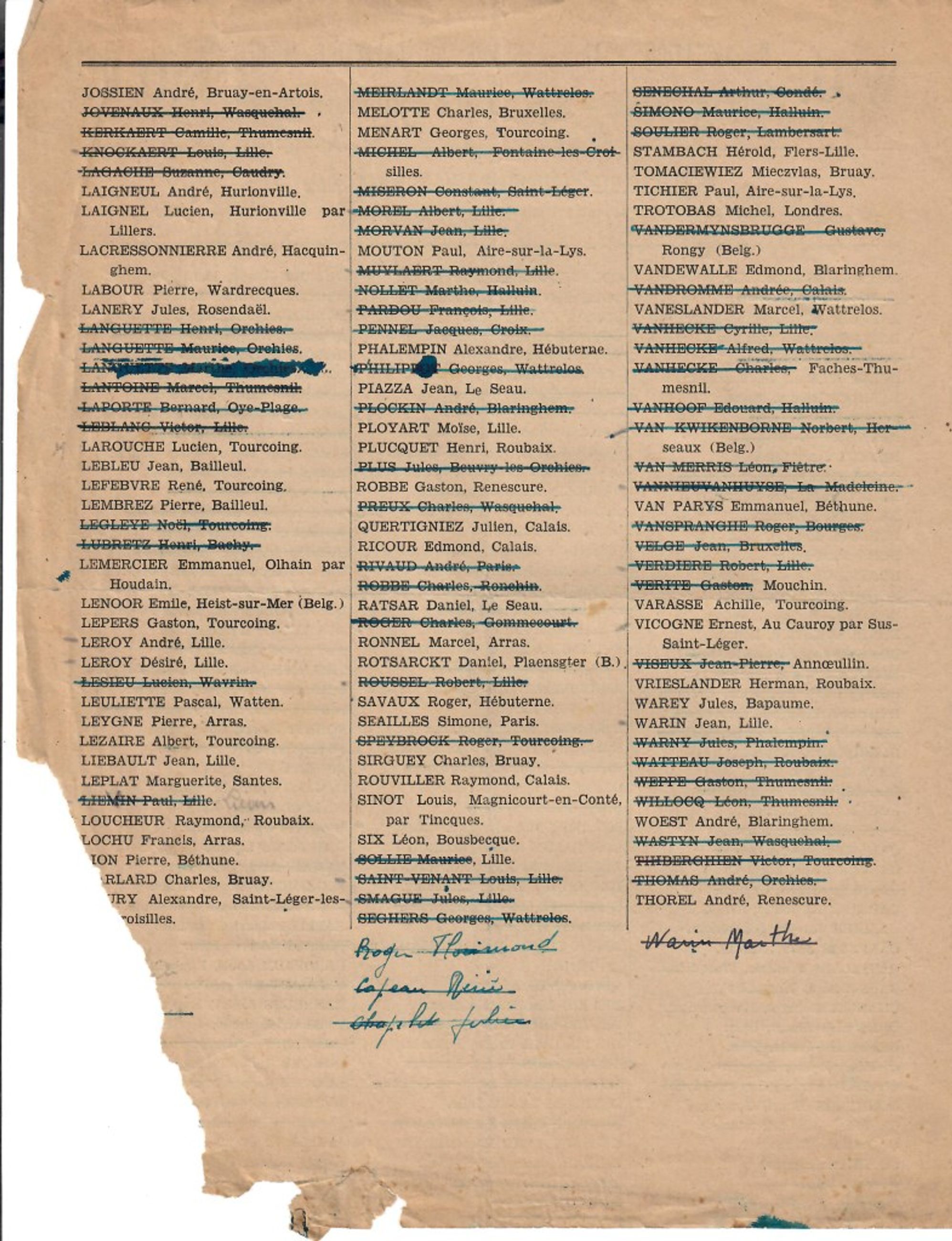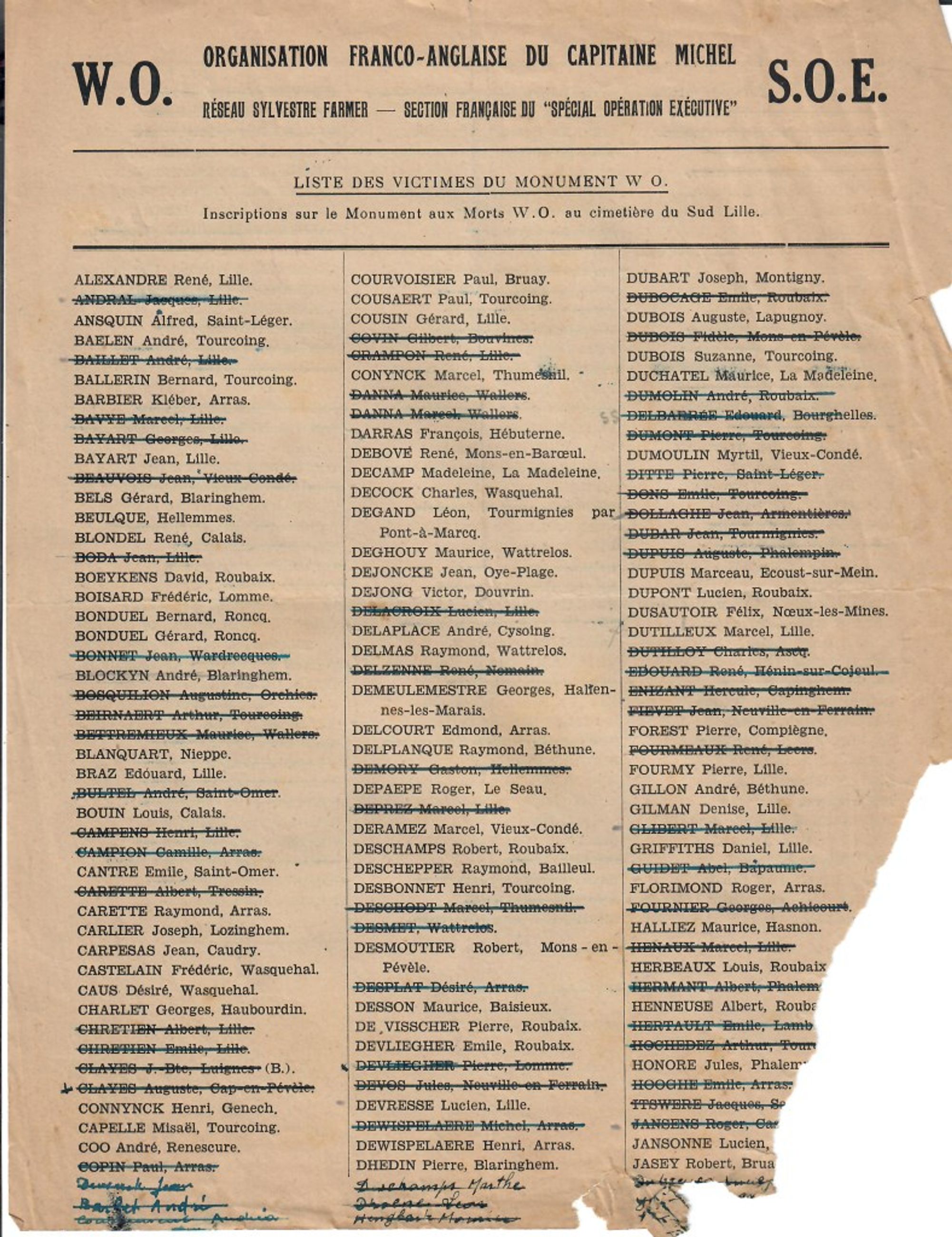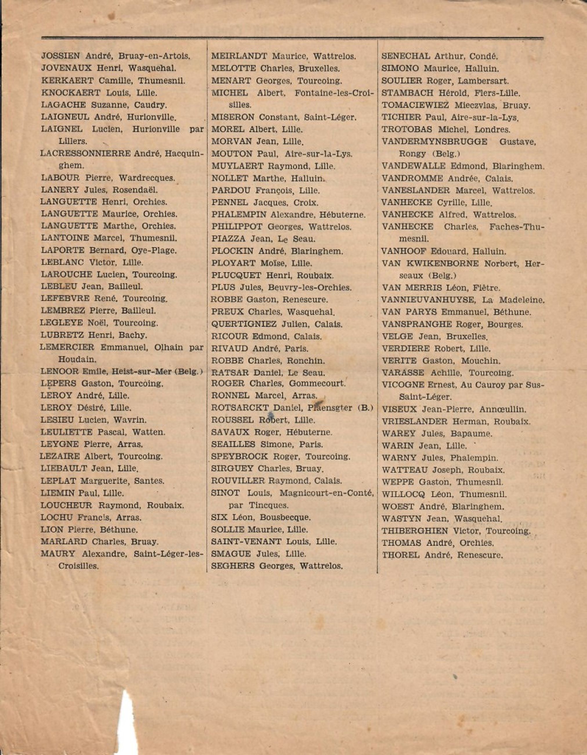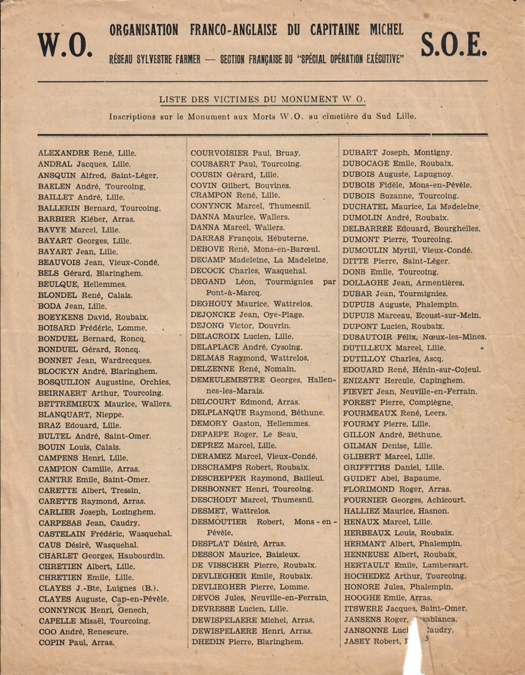 Liste - Liste des victimes du Monument WO au cimetière du Sud à Lille. - 2020.16.139