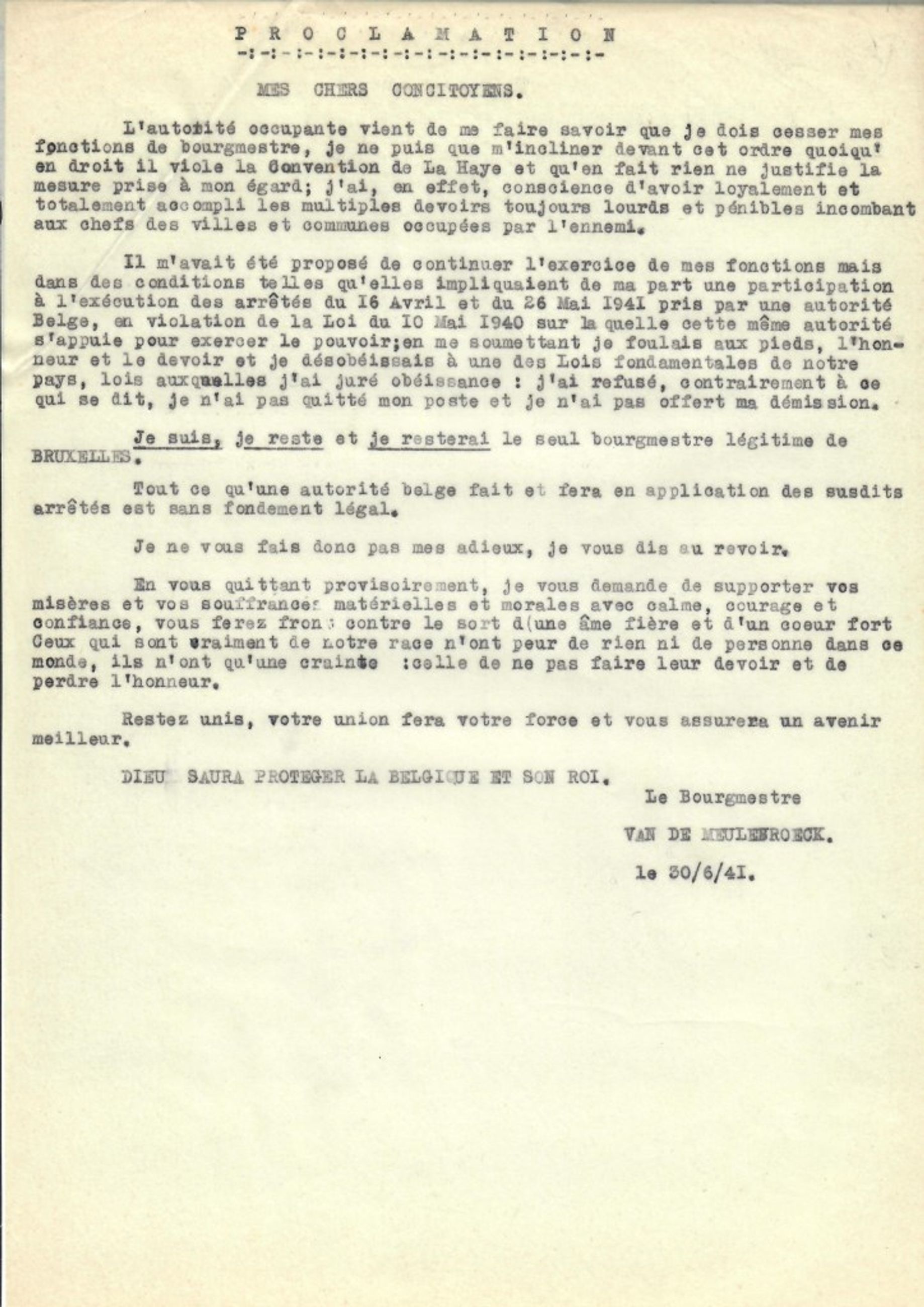 Il est arrêté le 30 juin 1941 et déporté en Allemagne. Il s'est adressé à la population par une "Proclamation" sur affichettes déclarant entre autres: "Contrairement à ce qui est dit, je n'ai ni abandonné mon poste ni donné ma démission. Je suis, reste et resterai le bourgmestre légitime de Bruxelles". Lorsque la ville est libérée au début septembre 1944, Joseph Vandemeulebroek reprend ses fonctions