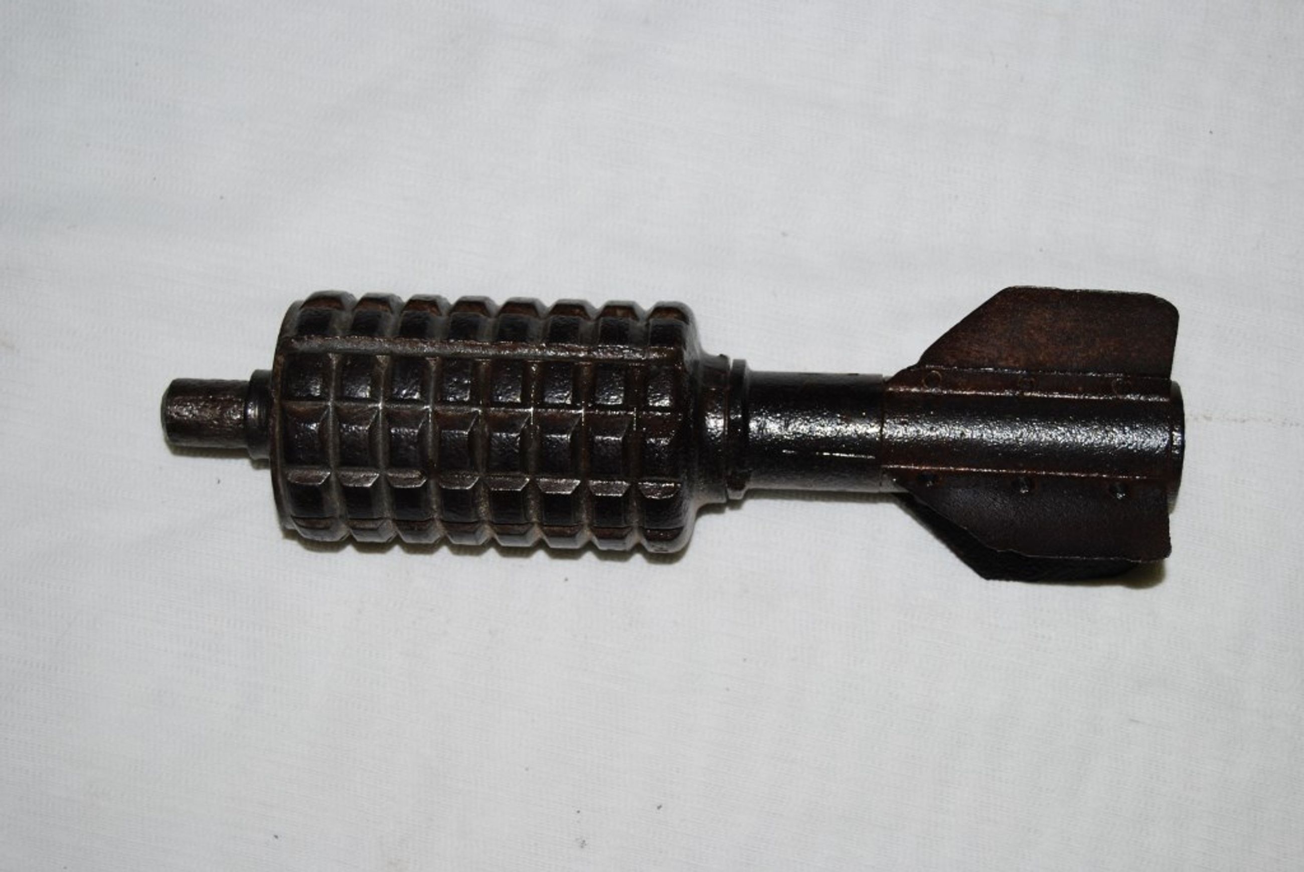 Projectile à corps cylindrique quadrillé et à empennage creux à quatre ailettes rivetées.