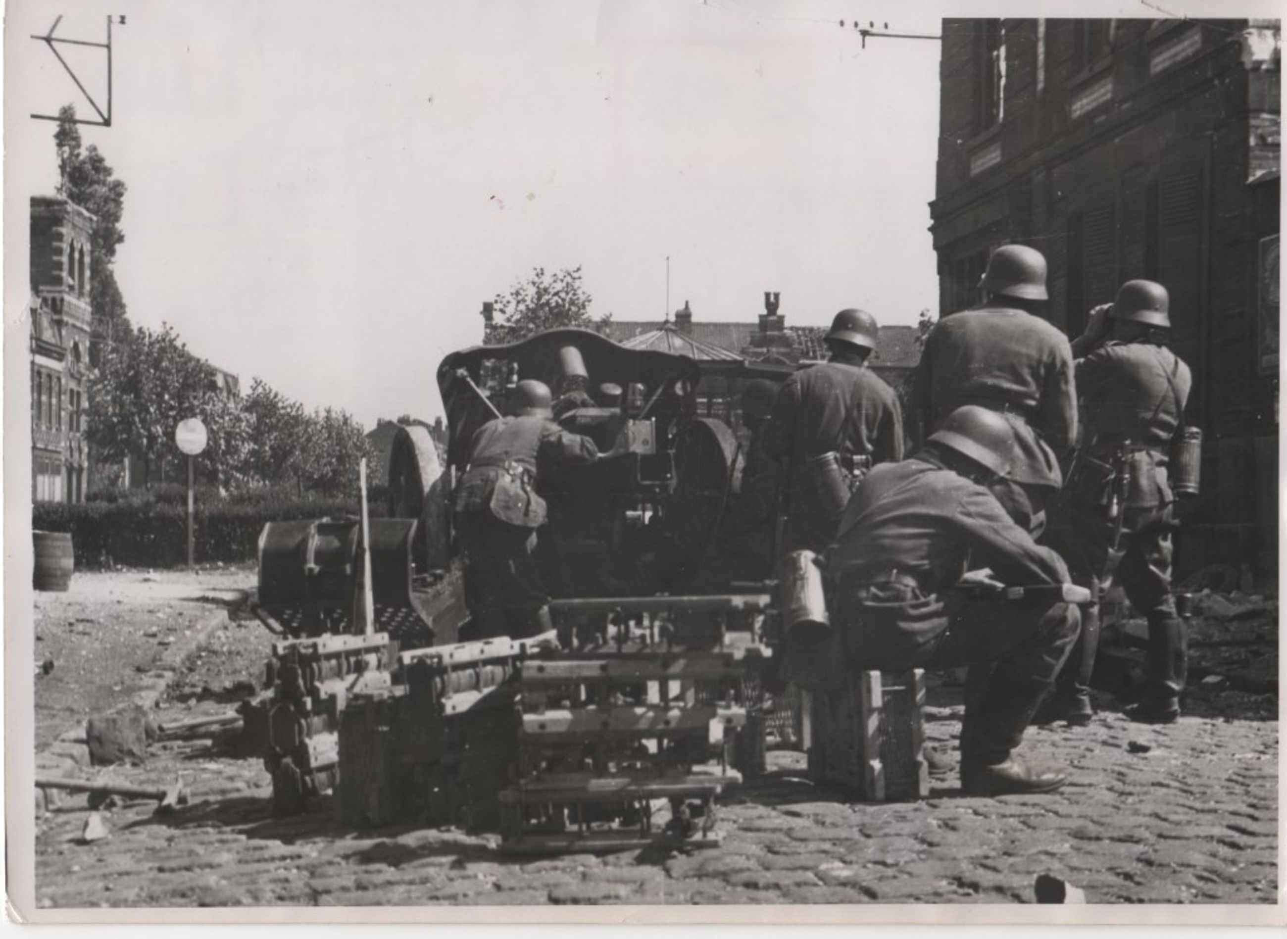 Tirage originale d'une photographie noir et blanc représentant un obusier de campagne de 10,5cm LeFH 18 allemand tirant en tir direct dans les rues de Lambersart fin mai 1940 lors des derniers combats de la poche de Lille.