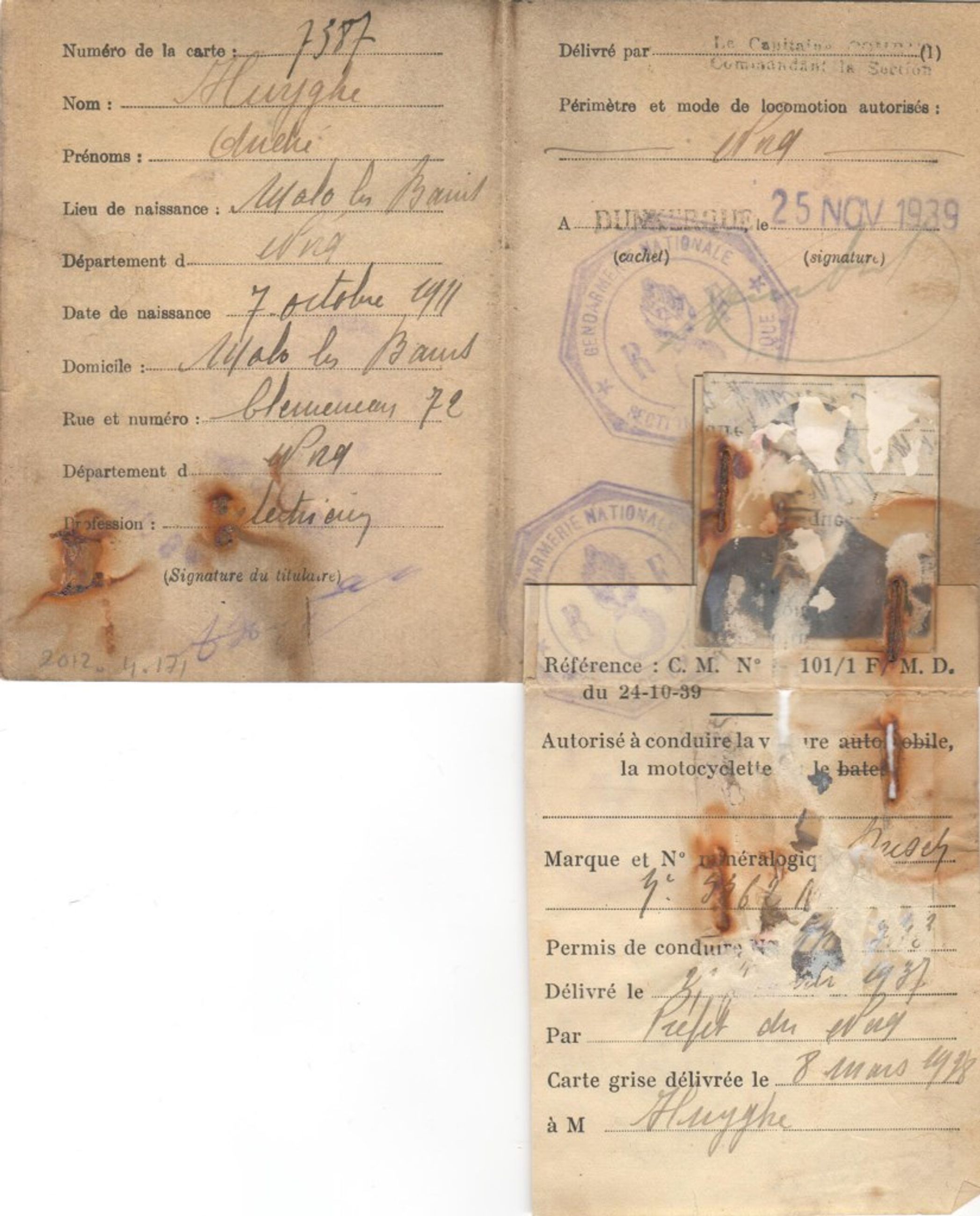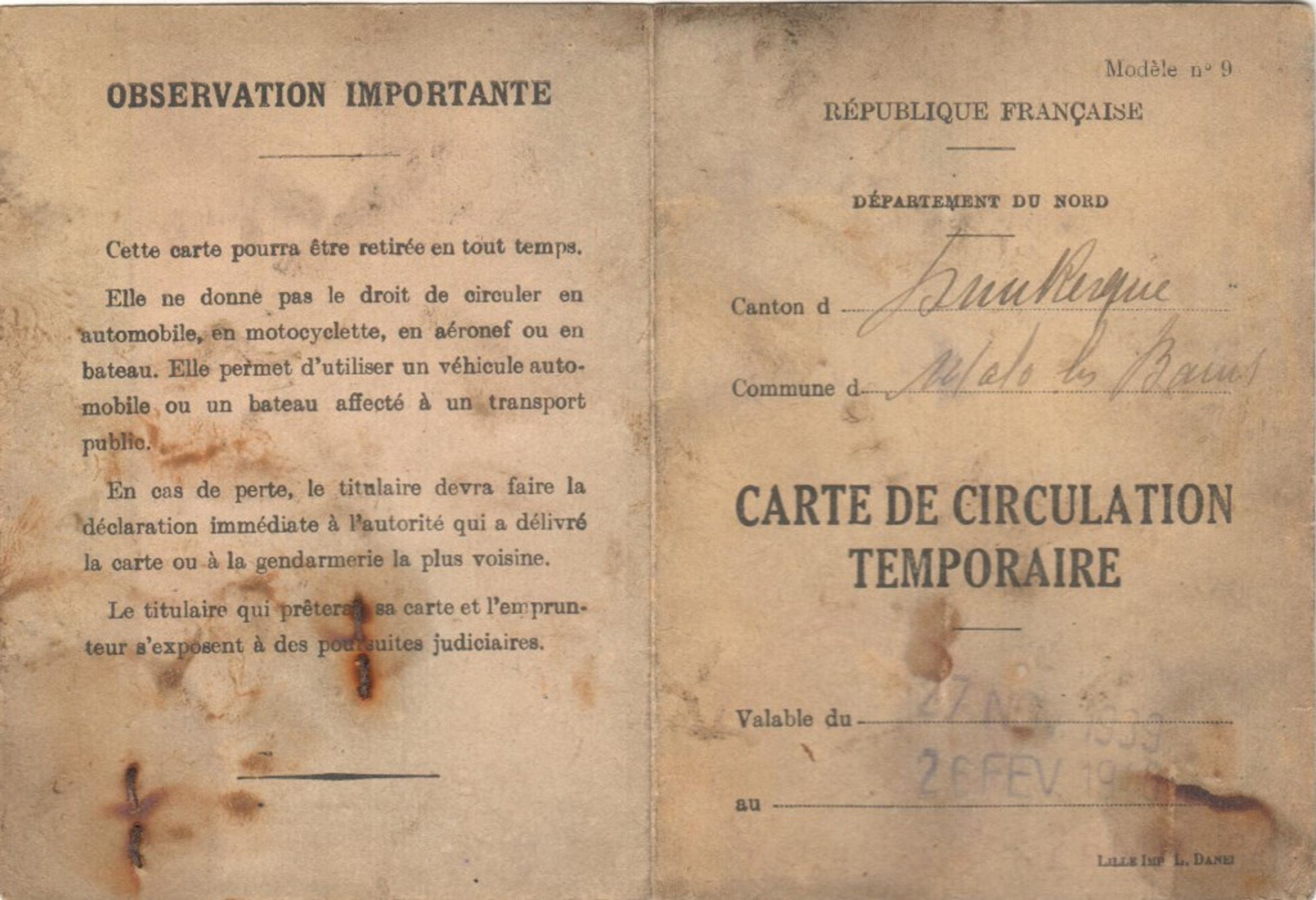 Carte de circulation temporaire - Carte N° 7387 valable du 27/11/1939 au 26/02/46 - 2012.4.171