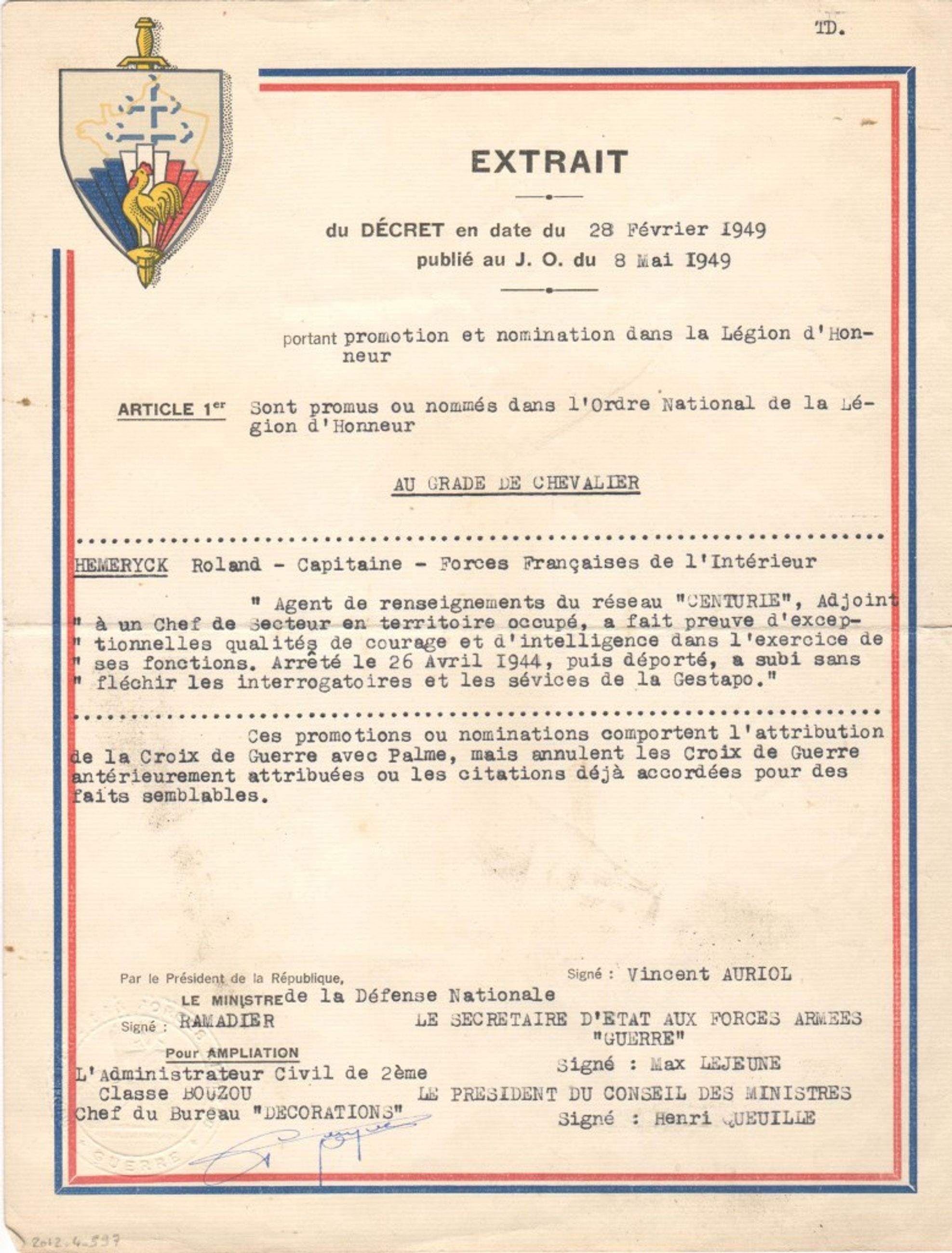 Citation à la Légion d'honneur - Au grade de chevalier - 2012.4.597