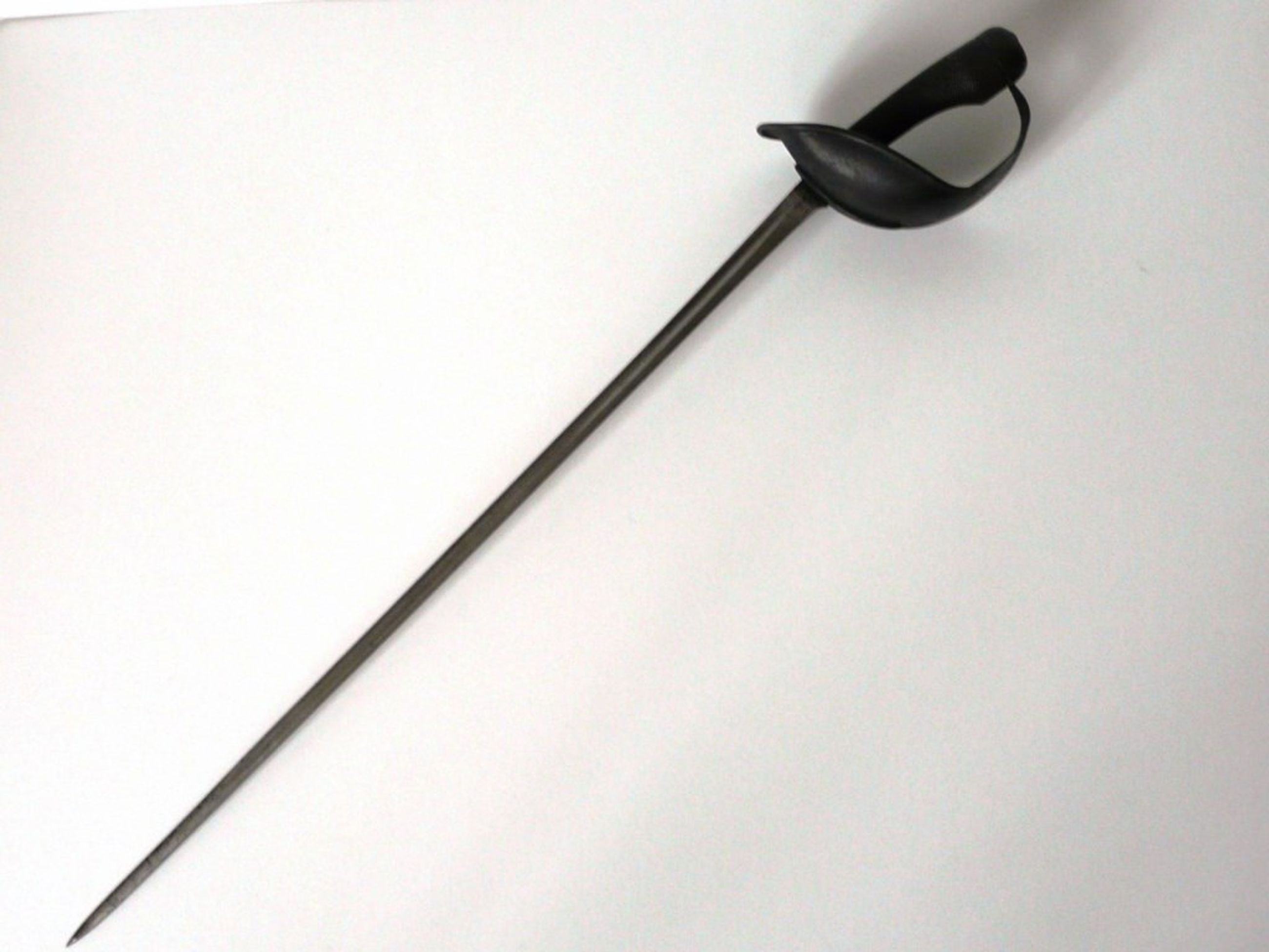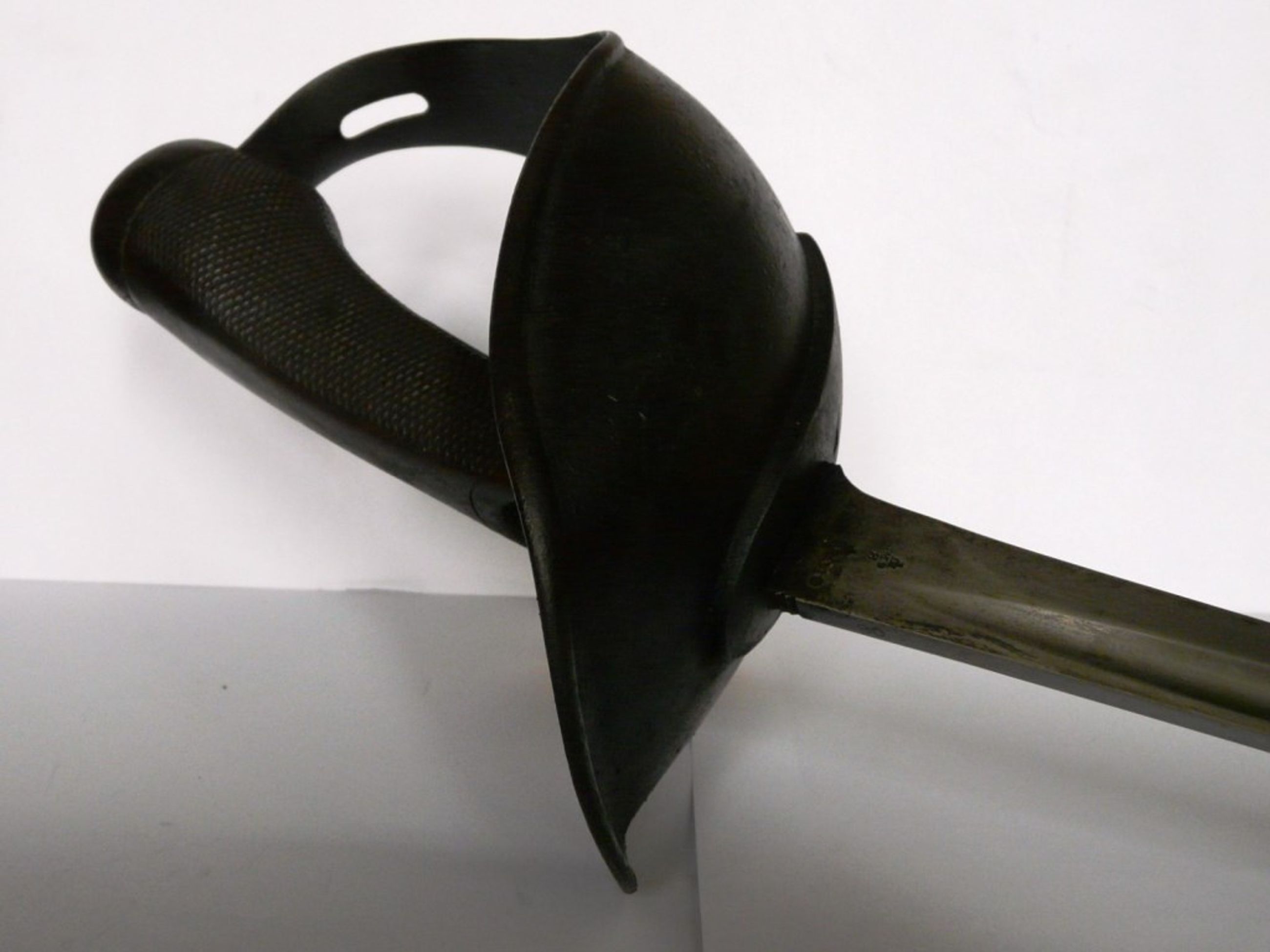 Sabre de cavalerie britannique. Ppoignée en caoutchouc durci, quadrillé, garde enveloppante en fer. Lame droite.