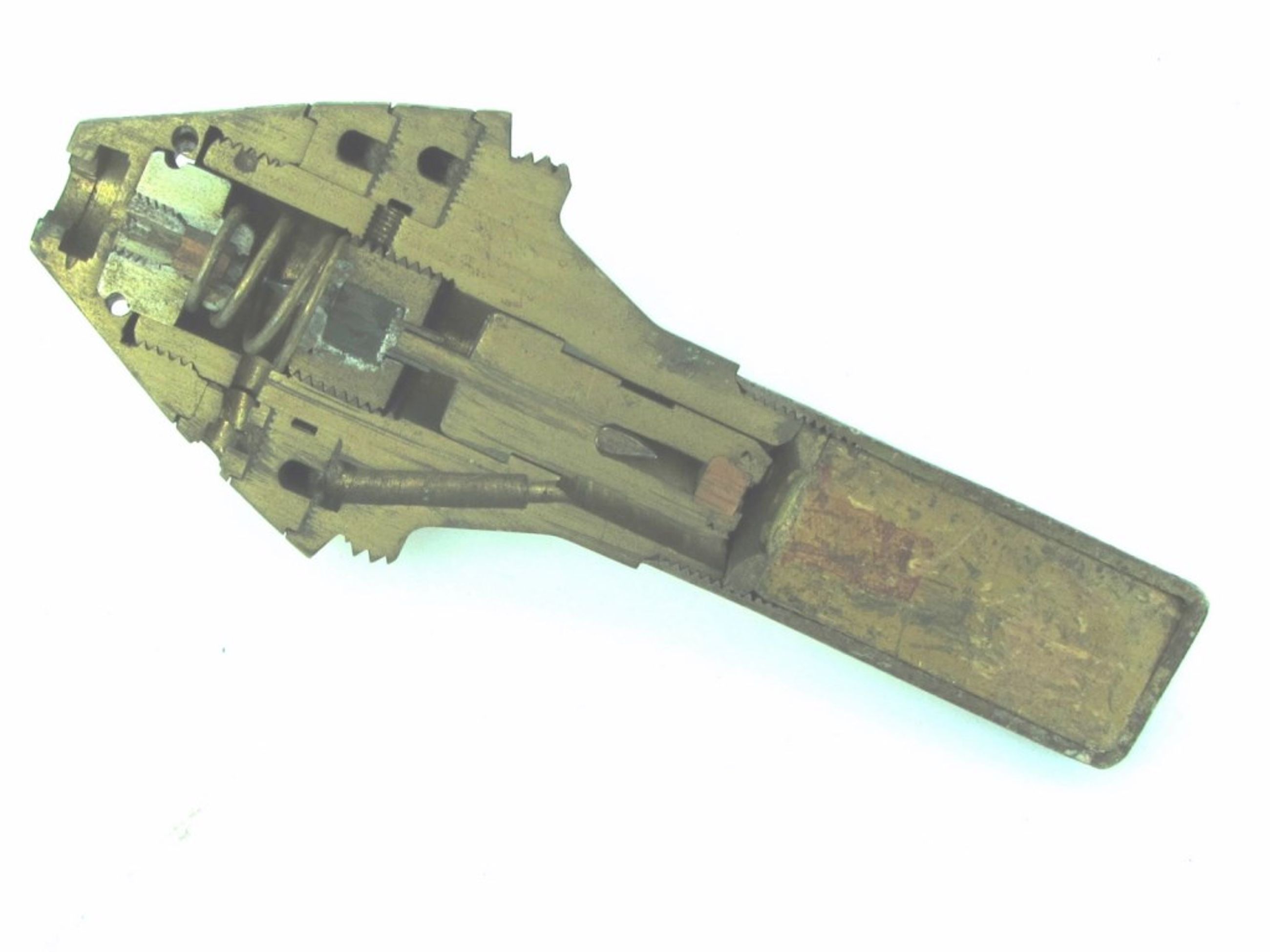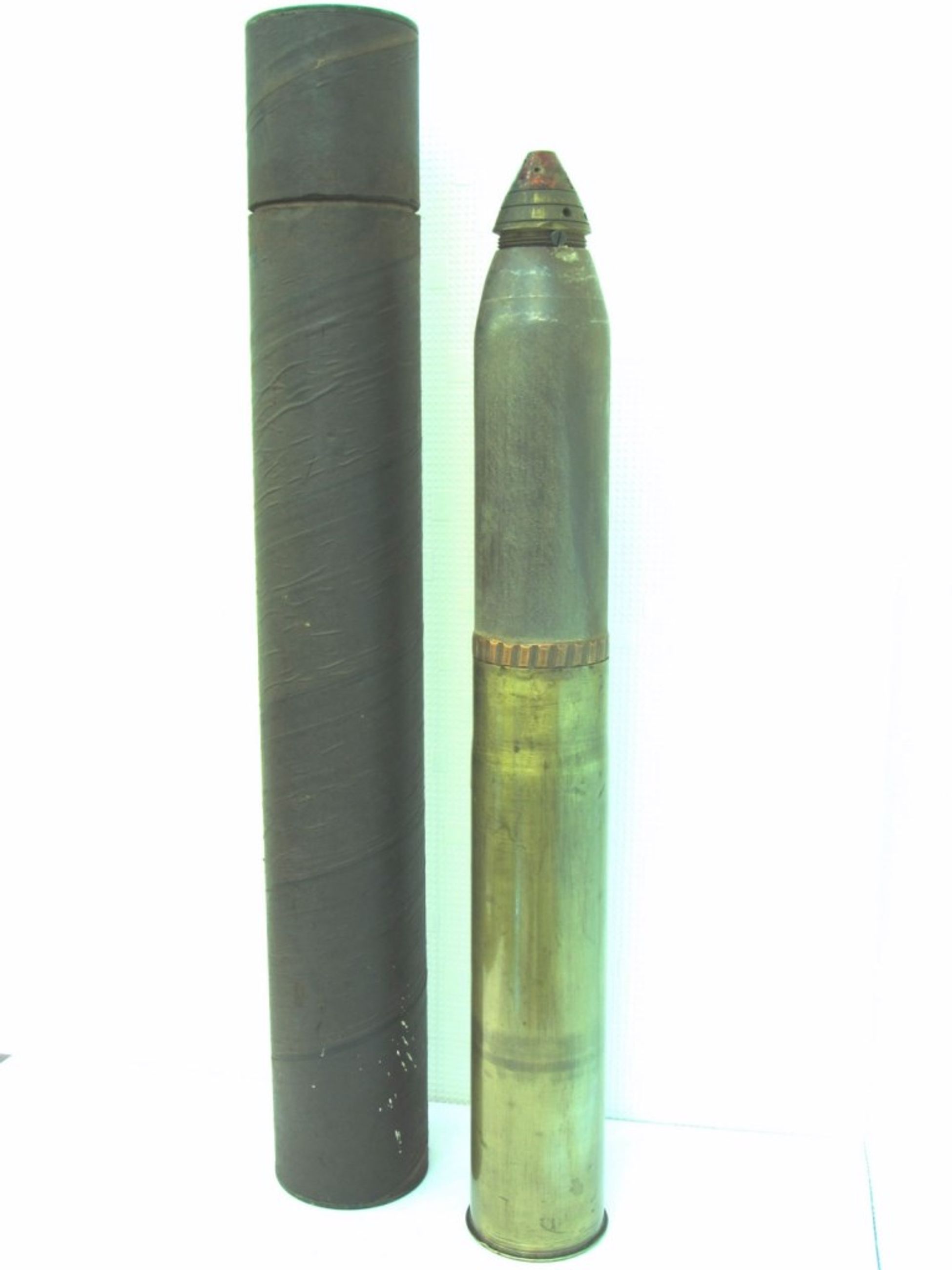Obus français de 75 mm, complet: douille en laiton de 35 cm de haut, corps de l'obus en acier (22.5 cm de haut) avec une ceinture en cuivre, fragmentée située au-dessus de la douille, fusée d'obus en laiton, coupée pour présentation.