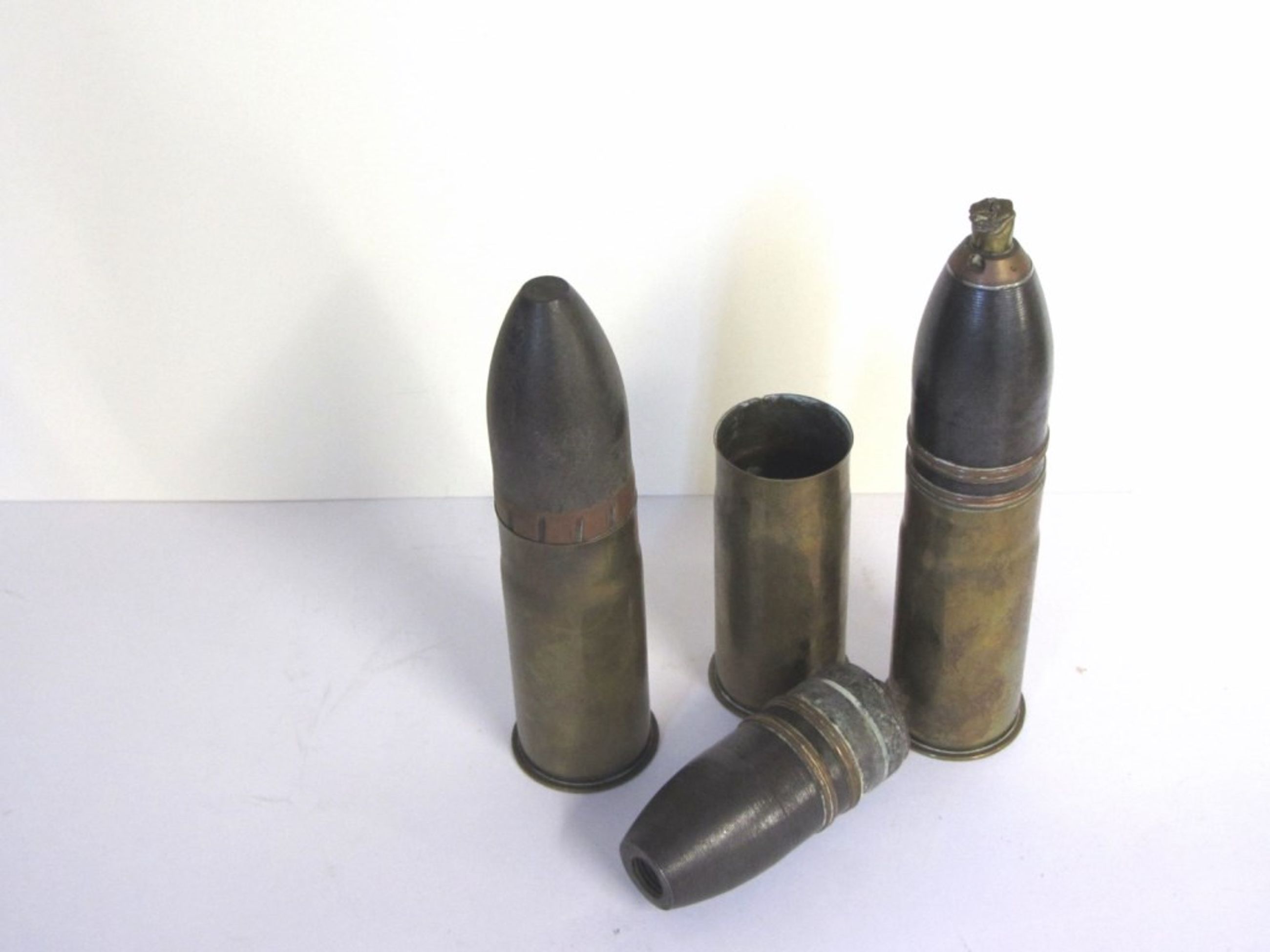 Obus français de 37 mm, avec corps de couleur noir non rainuré en fonte coulée puis usinée, de forme cylindrique devenant conique dans la partie haute. Présence d'une seule ceinture en cuivre. Douille en laiton.