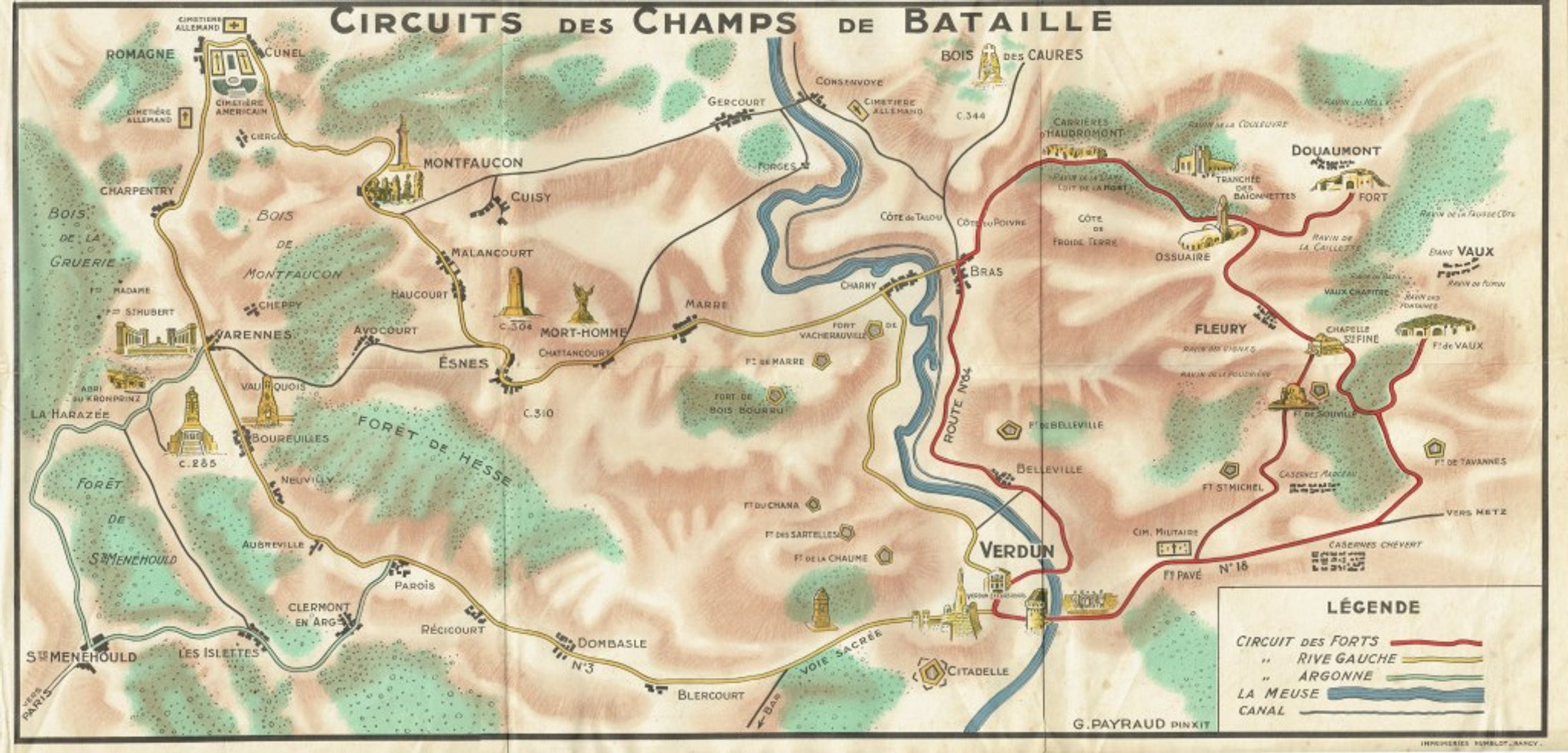 Carte touristique des champs de batailles du secteur de Verdun.