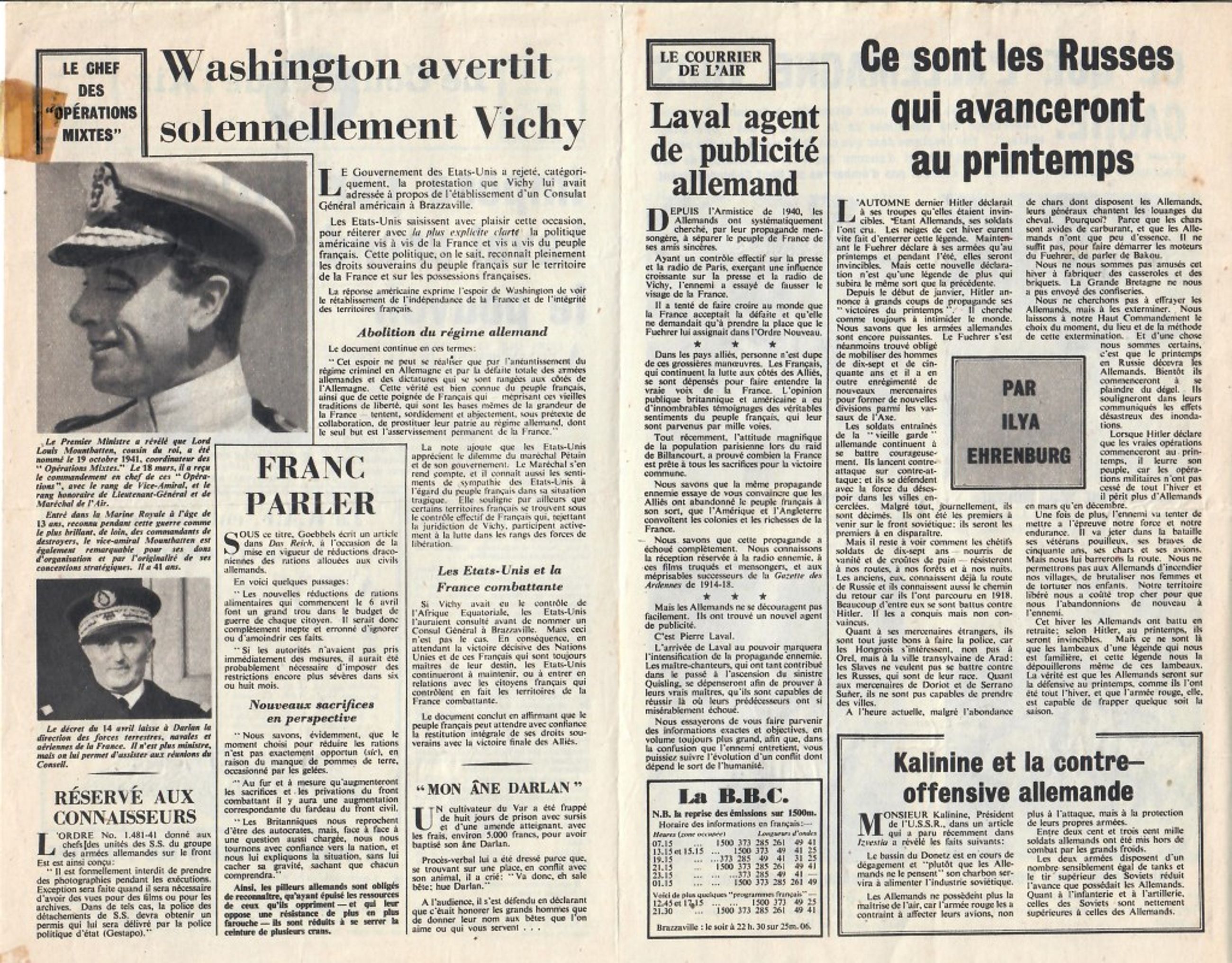 Illustrations : portrait de Laval / portrait de Lord Louis Mountbatten / Portrait de Darlan / Photographie de prisonniers britanniques blessés lors du raid de St. Nazaire / Photographie des dégâts causés au port de St. Nazaire notamment la descrution de l'écluse / Photographie de débris d'habitations ouvrirères démolies lors de l'attaque sur les usines de Renault / Photographie aérienne des ruines des usines Renault