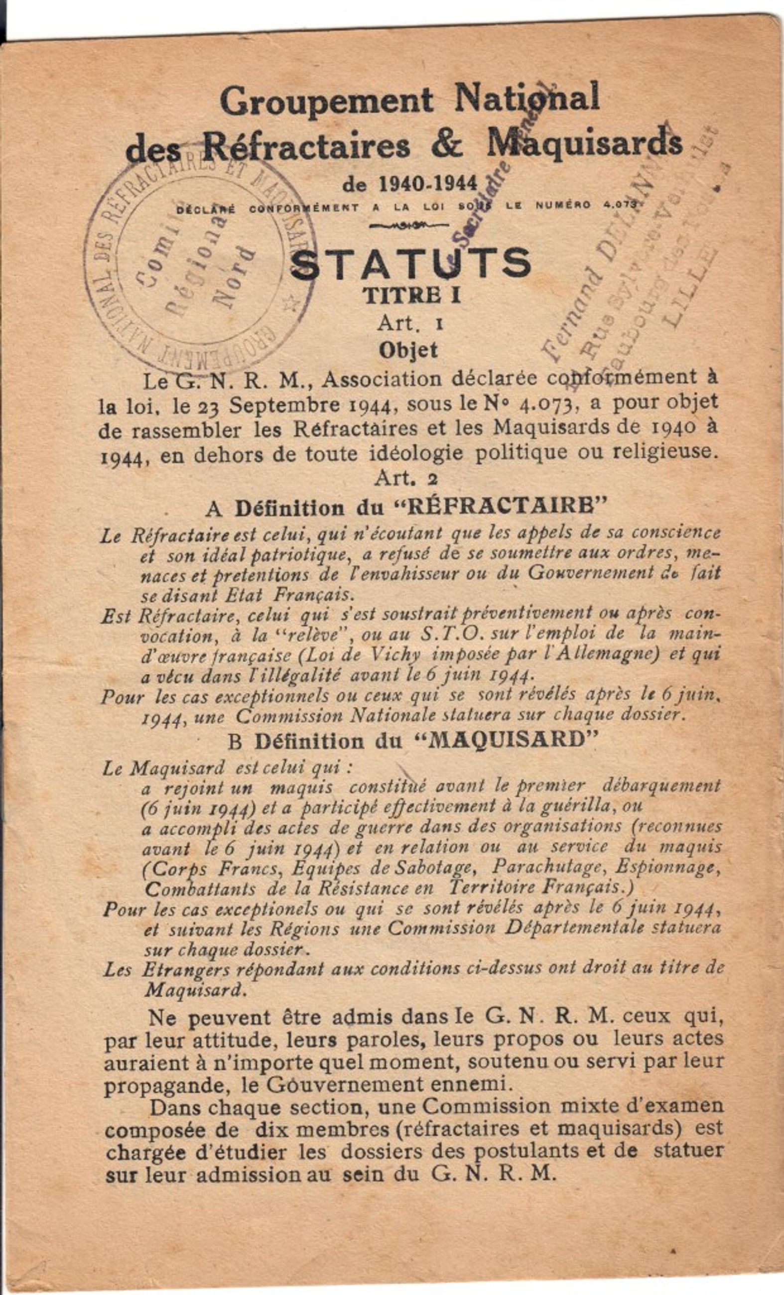 Statuts de l'association "Groupement National des Réfractaires & Maquisards de 1940-1944"