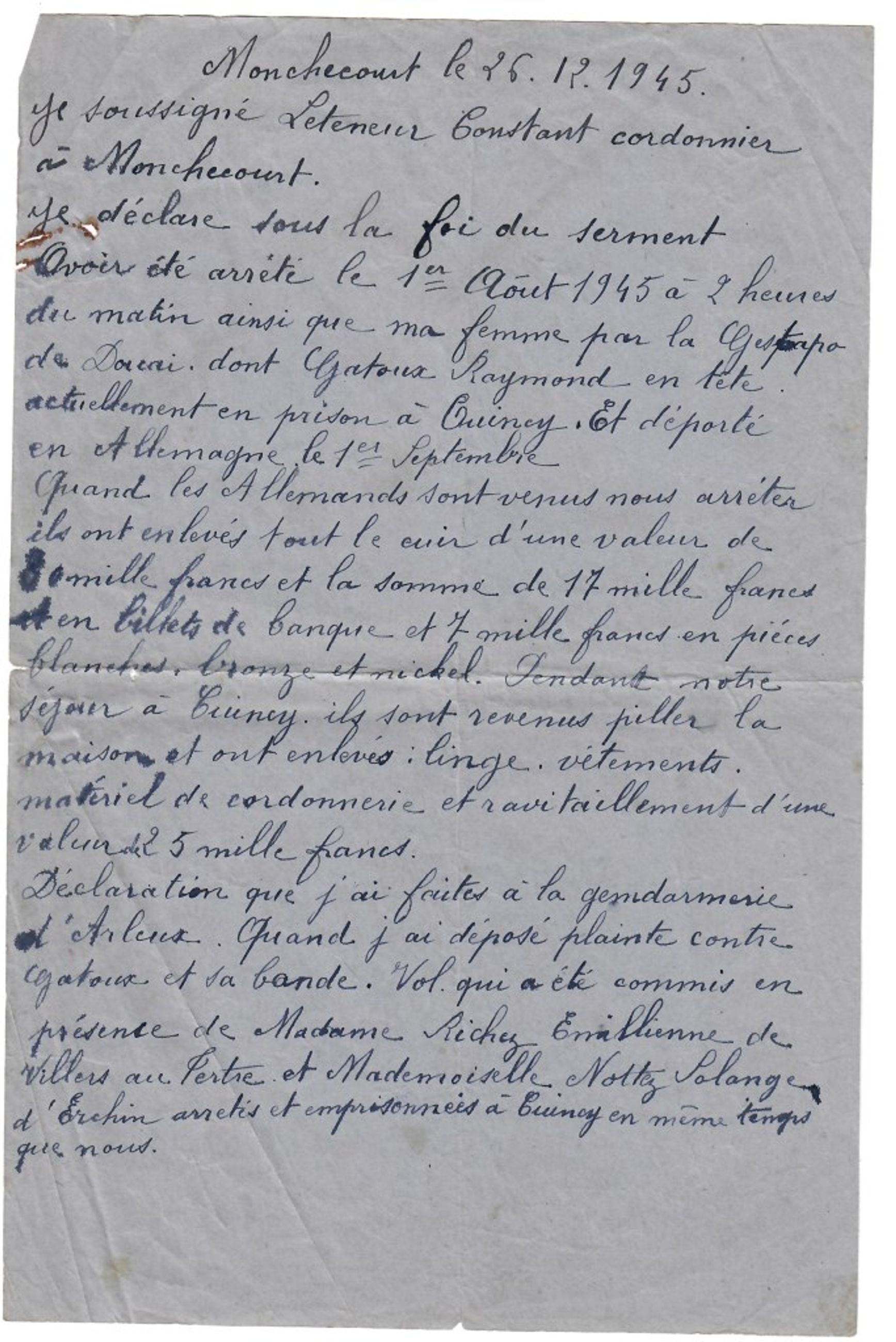 Ce document a potentiellement été rédigé pour servir de pièces à charge contre Raymond Gatoux, membre de la Gestapo, lors de son procès.