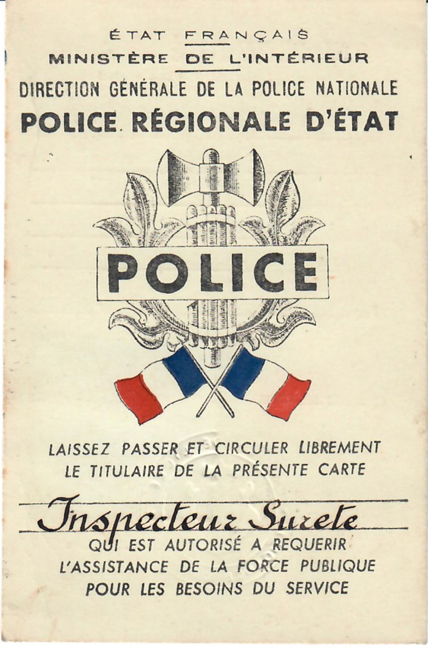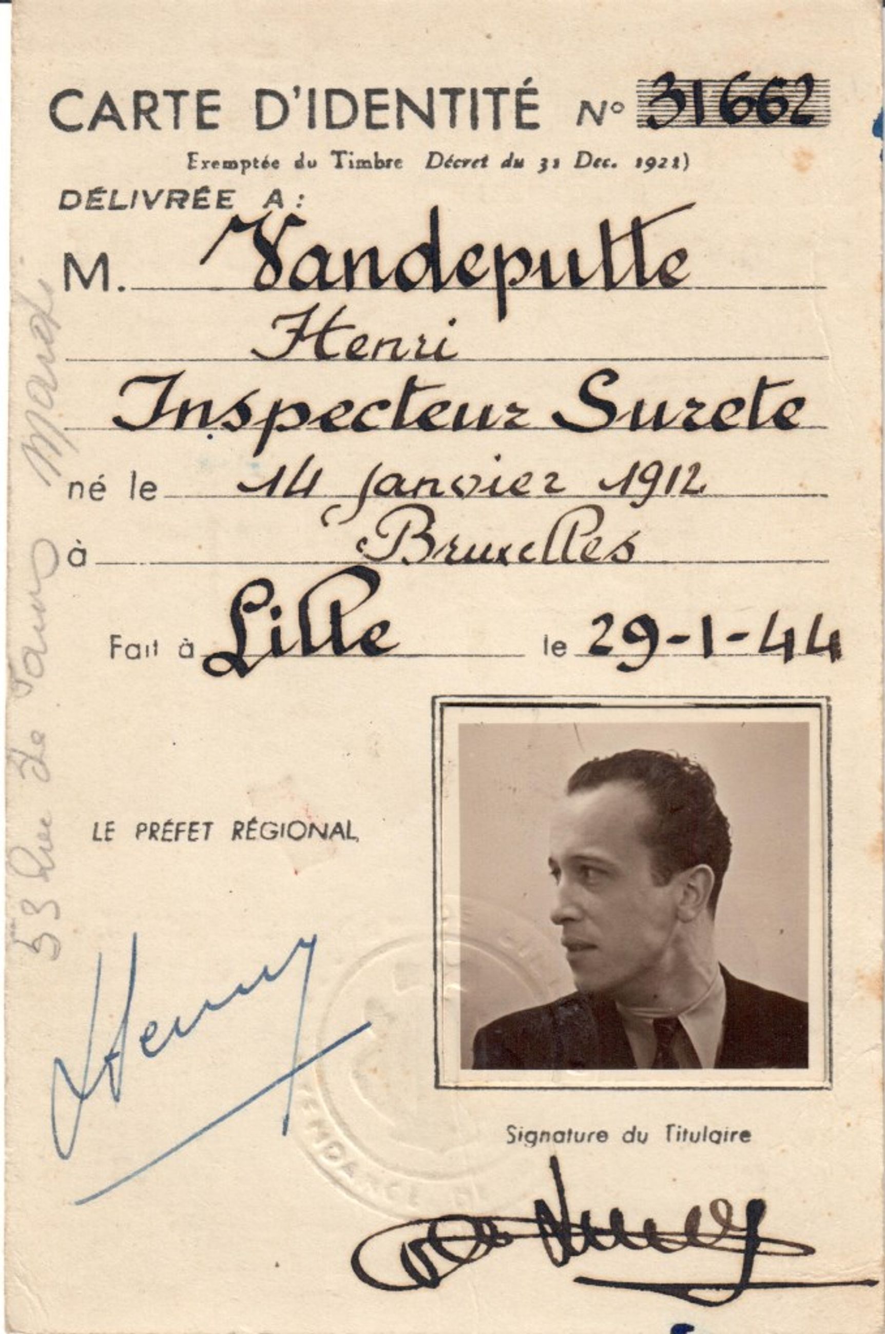 Carte d'identité de police régionale d'état au nom du résistant Henri Vandeputte