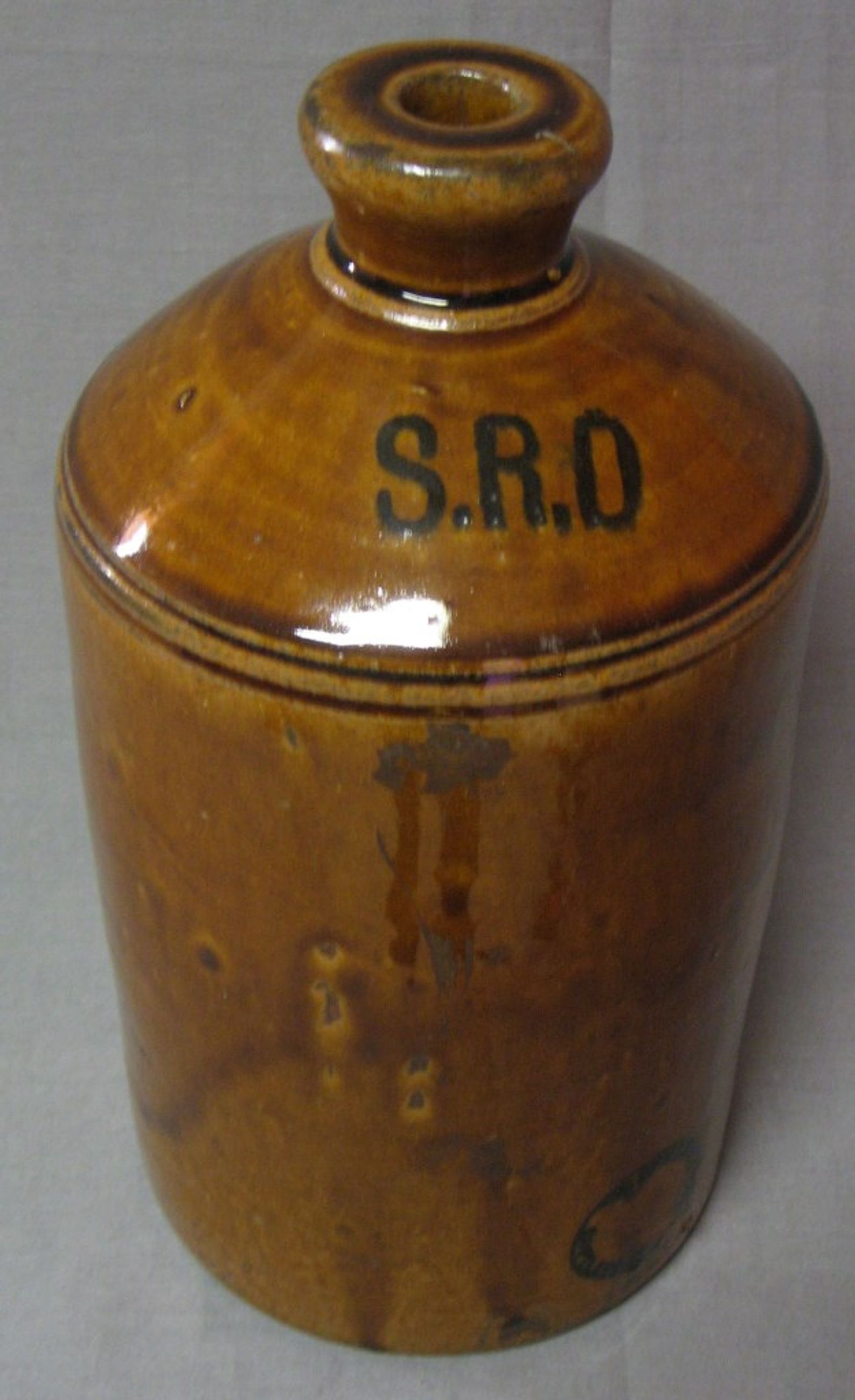 Cruche dite S.R.D. (Supply Reserve Depot) utilisée par les soldats de l'armée britannique pendant les deux guerres mondiales, généralement pour transporter de l'alcool. Elle est en terre cuite émaillée, dispose d'un goulot en guise d'ouverture et porte la marque "S.R.D." sur le dessus.
